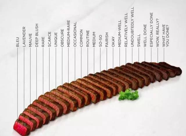 但有那么一帮特立独行的人,他们认为well done意味着十分熟,那么用偶数表示熟度更加科学,0-2-4-6-8-10,也就是近生牛排、二分熟、四分熟、六分熟、八分熟、全熟,他们被成为是“牛排偶数派”。