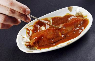 用牛肉精膏腌制猪肉:牛肉精膏呈深褐色,非常粘稠;刺激性气味强烈,闻起来是很浓的牛肉味。将牛肉精膏涂抹在猪肉上,此时猪肉已经明显变色,散发着阵阵牛肉味。