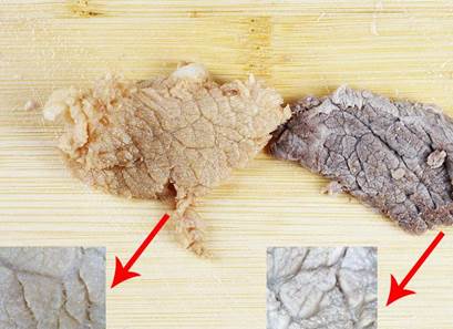 腌制左边的猪肉片:放在砧板上看,明显看出左边加入牛肉精膏腌制过的肉片比未加工的肉片深很多,色泽光亮,如果大家在市场上看到类似的“腌制牛肉”那就要小心了,很可能是假牛肉。