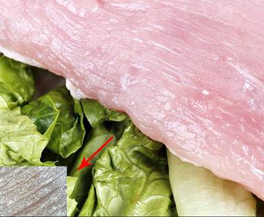 新鲜猪肉特写:左下方小图为这块猪肉在50倍光学放大镜下观察到的纤维及肉质情况。猪肉纤维长度短,肉质结构较细,用手戳猪肉能感到肉质松散。