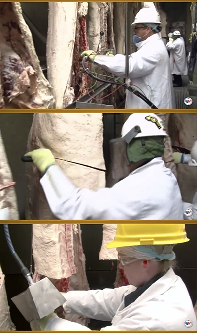刚开始, USDA 还是通过培训专业的评级人员通过肉眼来主观辨别脂肪均匀程度,如今已经改使用红外扫描仪了。一头牛被屠宰以后,先去除头部,然后被倒挂在生产线上,此时会有三名 USDA 评级人员推着扫描仪前来,第一个人负责找到 肉眼牛排 的准确部位,然后用一把电锯在牛身上划开一个切痕;第二个人紧随其后,用一把大刀对准切痕一刀切开;最后一个人则负责用仪器进行扫描评级。