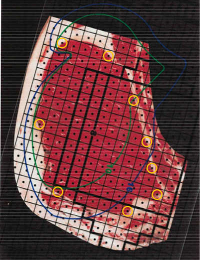 扫描仪中的画面,测定为脂肪雪花的部位被标定为黄圈