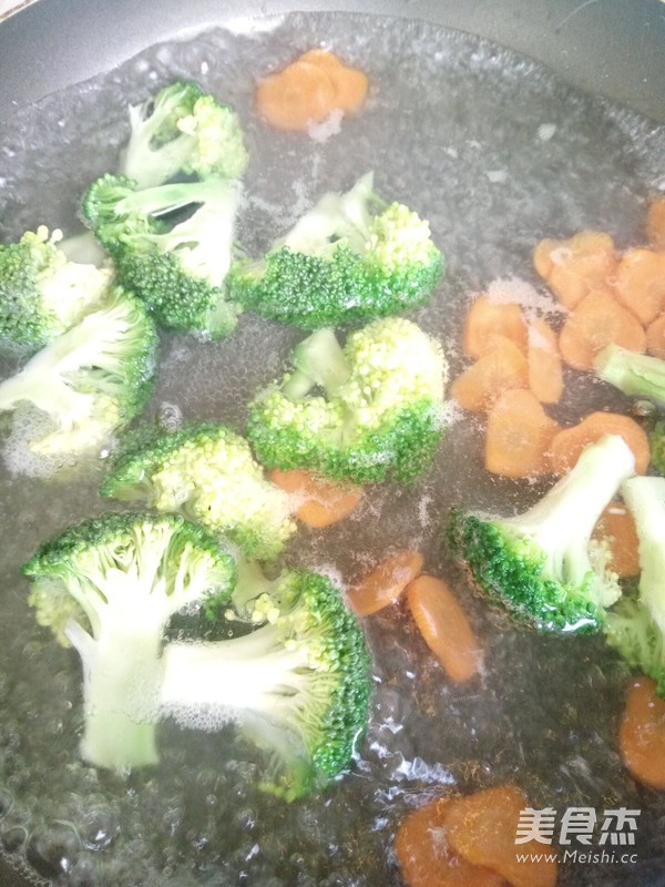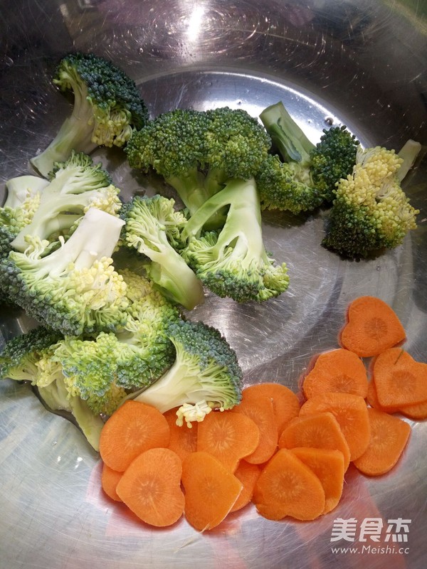 西蓝花掰成小块,胡萝卜用模子压成爱心装