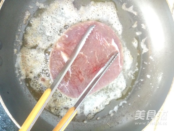 夹入菲力牛排,快速煎到两面变色即可,最多30秒就换面,夹起来放入烤盘备用,入烤箱,烤箱上下火,中层烤10分钟即可