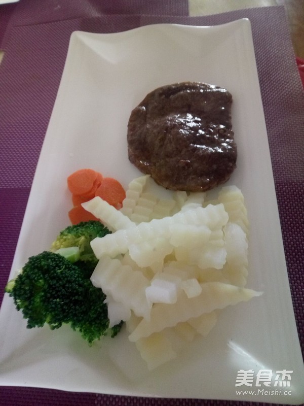 1、放入烤箱的时间,可以准备煮这些配菜,锅里一点点的油将西蓝花、胡萝卜、土豆煮熟捞起,摆盘