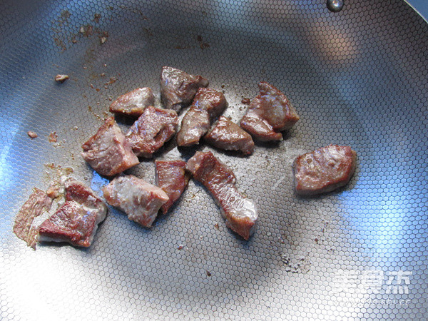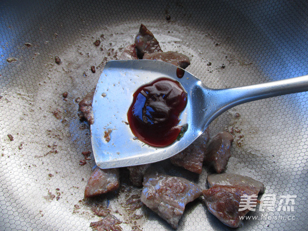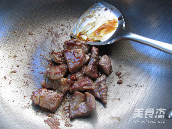 翻炒至蚝油均匀的裹住表面,肉质有7分左右熟,即可出锅