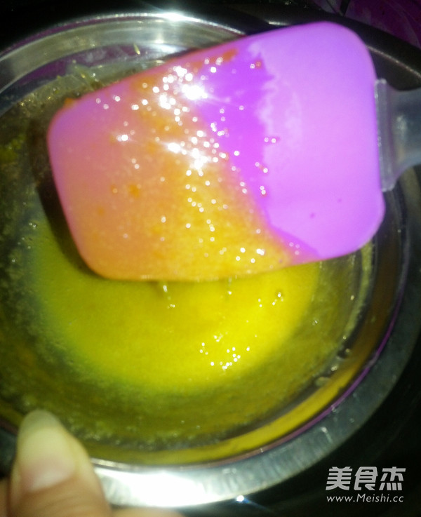 将蛋黄盆隔水持续加热,并不断搅拌,直至变得浓稠无颗粒,用刮刀提起,刮刀上挂着厚厚的一层,就说明可以了(此过程大约需要10分钟左右,要小火耐心)