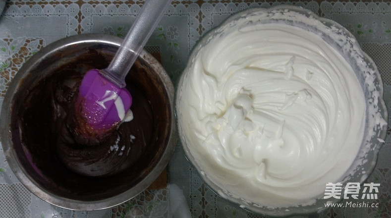将打发好的蛋清与蛋黄糊翻拌均匀后,再加入可可粉混合均匀