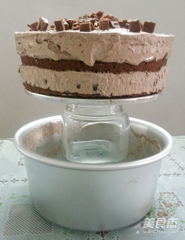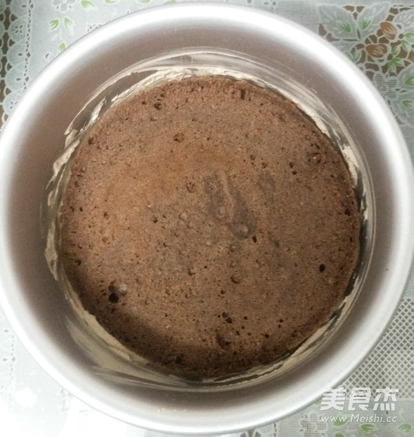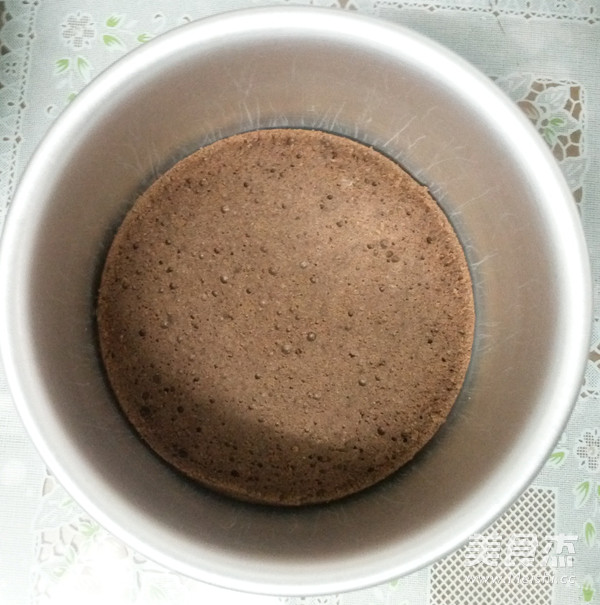 这里,拿过模具,放入一片巧克力海棉蛋糕(事先用剪刀剪小一圈)