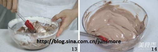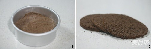 1.首先根据巧克力海绵蛋糕的做法制作蛋糕http://blog.sina.com.cn/s/blog_4a5089ff01017sgs.html。将蛋糕面糊装入6英寸圆模,放入预热好上下火180℃的烤箱,烤25-30分钟,直到蛋糕完全膨起。用牙签扎入蛋糕内部,拔出的牙签上没有残留物,就表示烤熟了