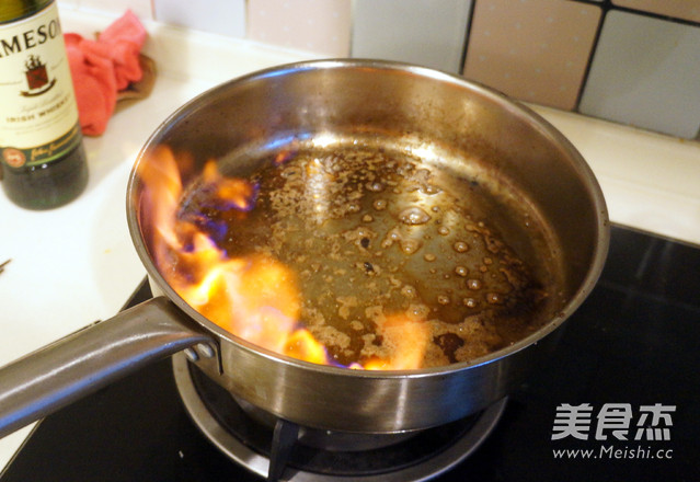 2、煎完菲力牛排后锅很烫,倒入威士忌时会蒸发掉不少,可以大胆地多加一些。推荐用爱尔兰产的Jameson威士忌。