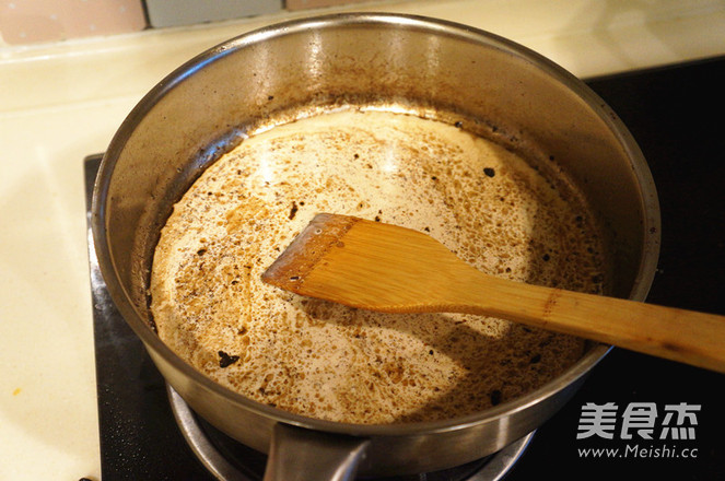 取出菲力牛排待用,注意保温。锅中倒入威士忌,加热约30秒。