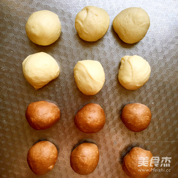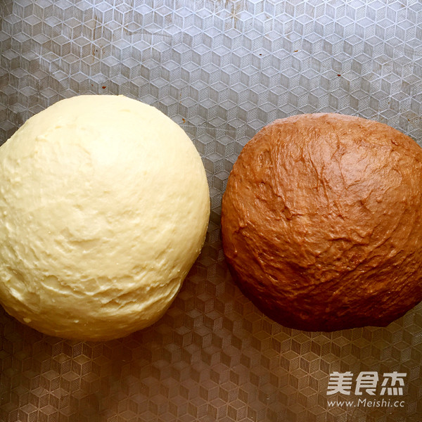 面团均分两份,一份加入黑巧克力,揉匀,放至温暖的地方发酵半个小时左右