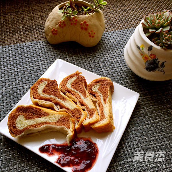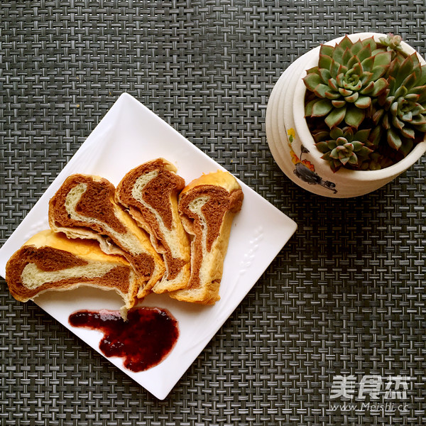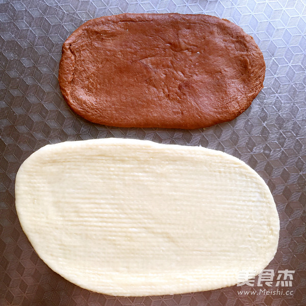 取一个原味面团和一个巧克力面团,擀成长椭圆形,巧克力放在原味上面