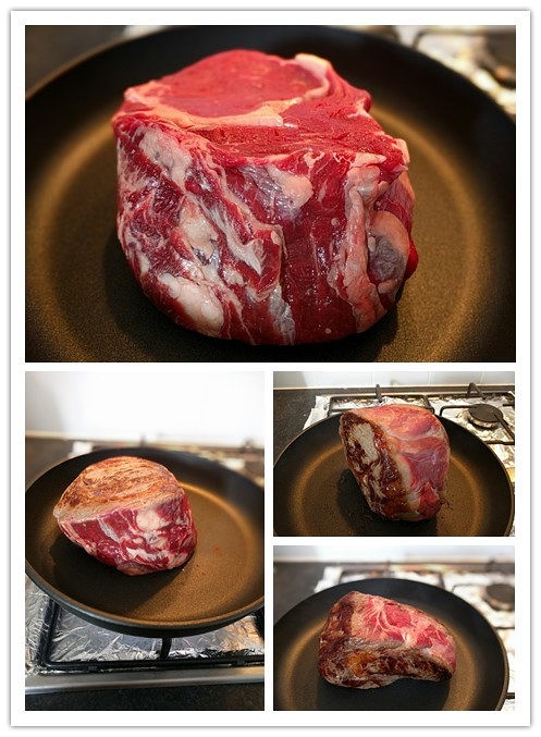 待牛排放置一段时间恢复至室温,将不粘锅烧热,不用放油,每一面煎一分钟,这块肉眼重约一公斤左右,煎的时间视牛排大小而决定。不粘锅如果质量不够好的话还是需要放一点油,但是既然一公斤肉眼38镑,不买一口好锅怎么对得起这块肉。