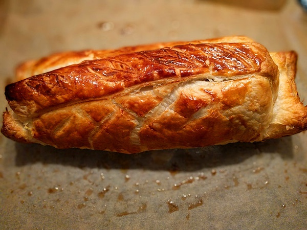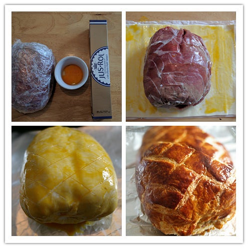 酥皮没有买到我平时用的牌子,但是换个牌子也没有太大区别。这块肉比较狭长,多余的酥皮上稍微弄了些花纹。