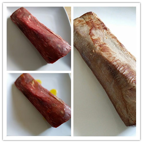 因为没有什么水分,脂肪只有10%,所以在表层抹了一层橄榄油之后再下锅煎,这块肉只有半公斤,所以每面各煎30秒即可。