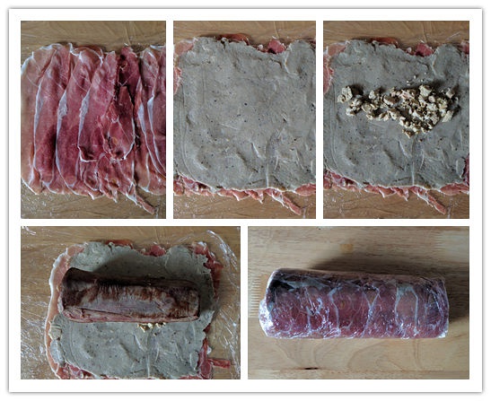 在桌上留一大块空地用来铺保鲜膜,我大概铺了三层保鲜膜,面积差不多有半平米。将帕尔马火腿展开铺平,鉴于这块牛排很大,所以铺了两层火腿。再在火腿上涂蘑菇泥,四边可以不涂,否则会不好卷起来。最后均匀撒上鸭肝泥块,鸭肝泥是直接从冰箱里拿出来的,因为是用肥鸭肝做的,所以原本是固体的鸭肝泥加热会融化,融化之后能够均匀涂在蘑菇泥上,但是我并不是很想冒这个险,有兴趣的小伙伴可以试试看。