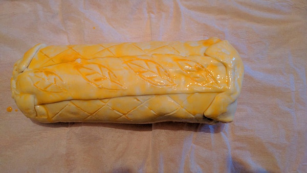 酥皮铺开,把牛肉卷的保鲜膜去掉,包起来之后在外层刷上蛋黄,想雕花的话可以雕个花,不想雕花也并不影响口感,反正雕花这种形而上学的东西存在的意义只有美学价值而已。