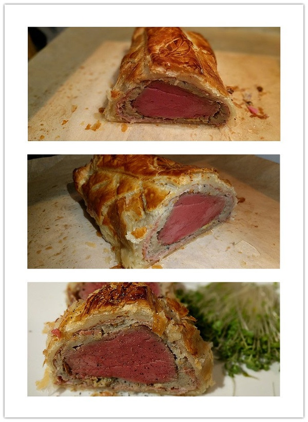 切开来之后是这样的,非常完美的粉红色,一滴血水都没有,牛里脊经过整整50天的干式熟成之后有着与新鲜牛肉完全不同的柔和风味,蘑菇泥滑嫩甘美、鸭肝泥入口即化、帕尔马火腿芬芳咸鲜、酥皮在咀嚼的时候发出令人愉悦的脆响。