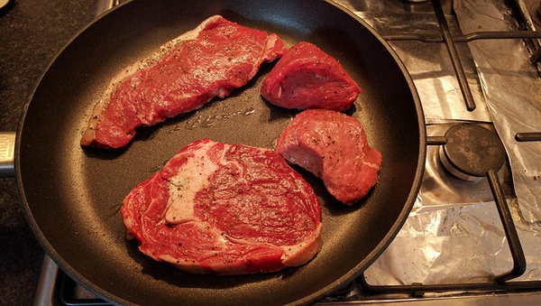 表面涂上橄榄油,撒上盐和胡椒,放置至室温即可开始煎, 煎的时候用好一些的不粘锅,烧热之后将肉放进去。因为已经涂了油所以煎的时候不要放油,否则会炸得到处都是