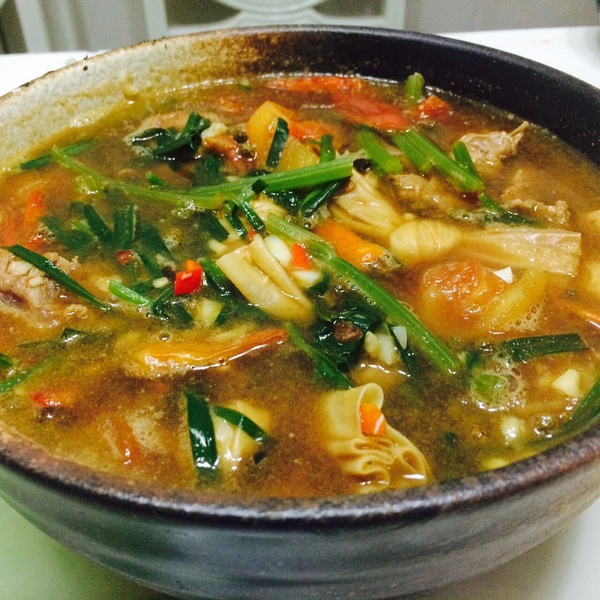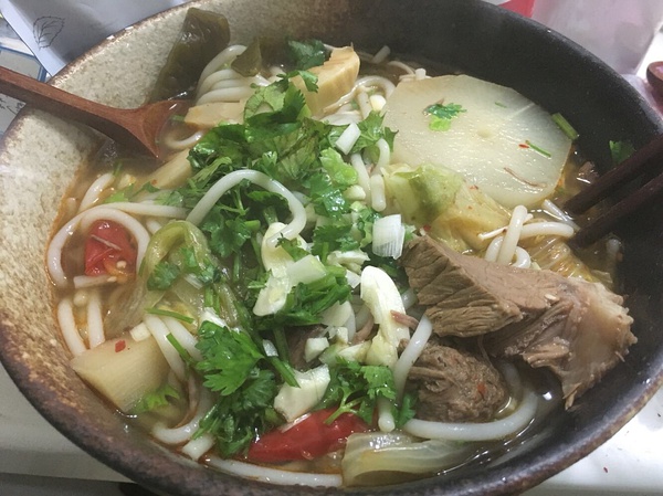 (4)前一阵的诡异发明,但超好吃。牛肉汤煮进去白萝卜酸笋海带,酱油调味,然后煮进去粉面,撒香菜蒜蓉小葱。
