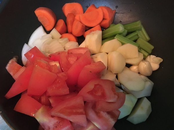 两三个番茄,半根胡萝卜,半个洋葱,一根芹菜,一个大土豆,五六瓣大蒜,切成长图这样,加点油翻炒。