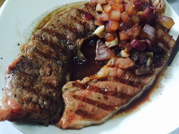 肉先放盘子里一会儿,锅里用橄榄油炒点洋葱碎,撒点红酒,倒进去肉渗出的很多汁水,自己根据喜好加点黑胡椒盐都行,不过不加时候味已经挺足了,然后浇在肉上就可以吃啦。这个厚度,这个时间,中间还是粉红色,是我比较喜欢的状态。可以根据喜好自己加减时间。