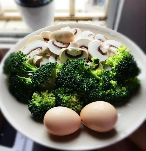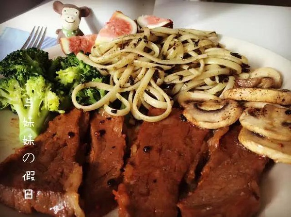 西兰花是牛排餐中必不可少的,白蘑菇新鲜,配色也好看。