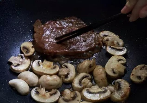 白蘑菇可以与牛排一起煎,这样也就有了黑椒味,两分钟后翻面。牛排我们喜欢吃七分熟,我通常用筷子戳,看是否有血水渗出,如果只有少量血水,那就差不多了。