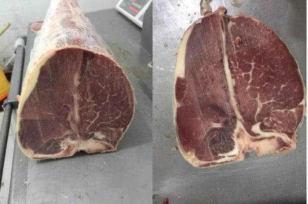 先上个真T骨的图。T骨在切割成牛排之前,是一根长条,这同一根长条T骨切除来的形状是完全不一样的,差异很大。大家看下面这个图。虽然巨丑,但是它是真的。