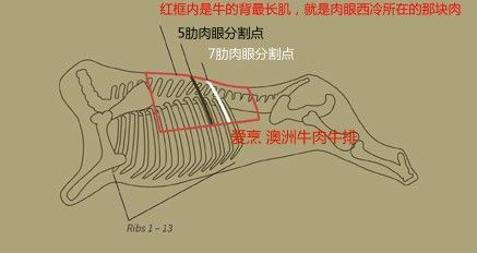 如上图所示,牛一共有26根肋骨,把整牛劈成两半,单侧就有13根肋骨。肋骨上附着的一个长条形肌肉就是背最长肌。