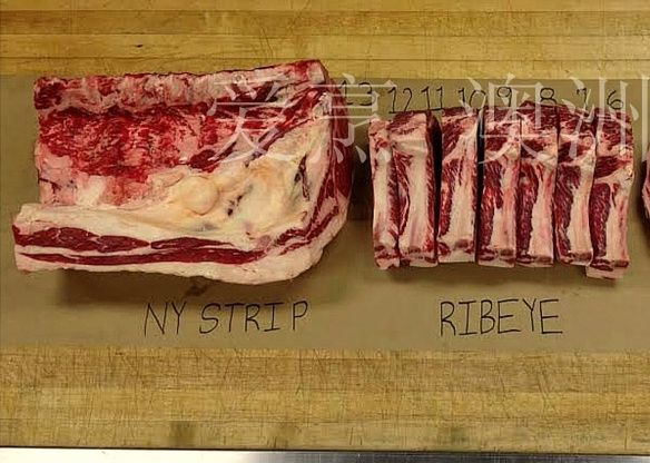 把上面的大块肉如果再切成片状,就是我们平常买到的西冷牛排和肉眼牛排。