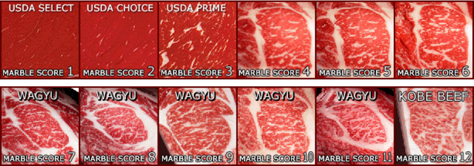 3、到了第三步,相比您已经选好适合您的牛排部位了,那么接下来还有一样和价格有关的知识,那就是牛排的等级(牛排等级选择不适合菲力牛排)。我们把牛排等级从M1-M12,以牛排脂肪分布多少为优劣,脂肪越多,牛排等级越高。但是也有不法分子采用注射脂肪到牛肉里的手段生产注脂牛排,其特点是牛排华为不自然。大家看得多了,一眼就能分辨出来。下图为牛排等级图: