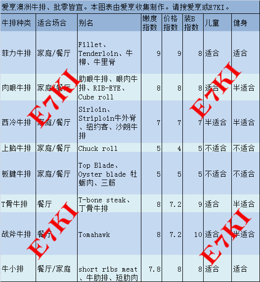 2、再者,根据牛排的口味特性选择牛排,下图列出了这些牛排的特性,大家可以参考一下。