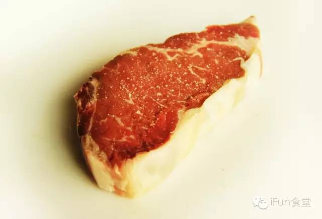 ③ 处理后的西冷牛排双面撒上盐,简单腌制;
