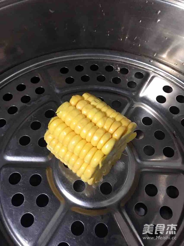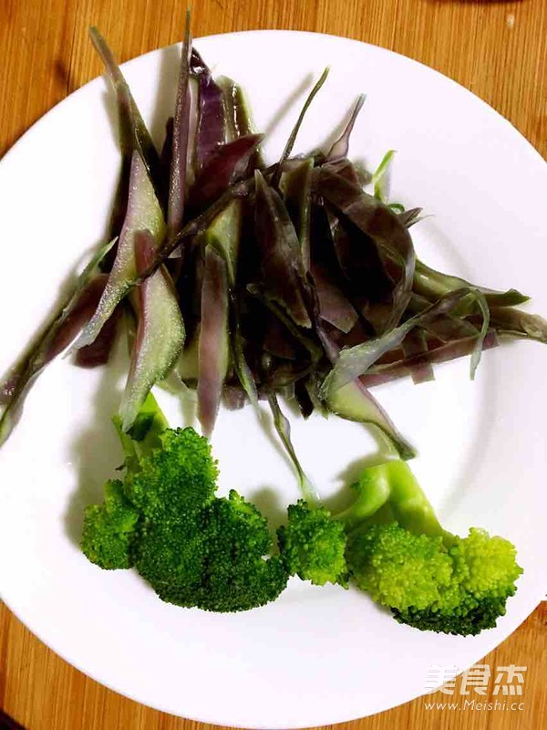 利用蒸玉米的水放入西兰花和紫甘蓝分别焯烫熟捞出,均匀撒上半克细盐。