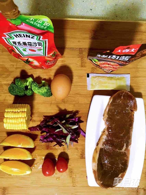 1.甜玉米去皮去须,西兰花和圣女果洗干净,橙子洗净切块,紫甘蓝洗净切细丝。西冷牛排、黄油、西冷牛排酱、番茄酱和鸡蛋取出备用。