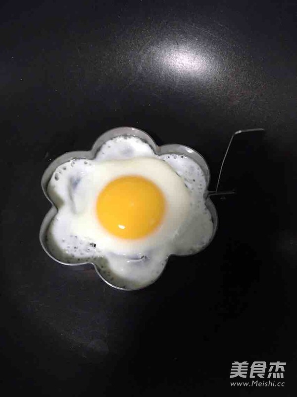平底锅放入模具,烧热放入黄油融化,磕入鸡蛋小火慢煎5分钟左右至溏心,均匀撒上半克盐。