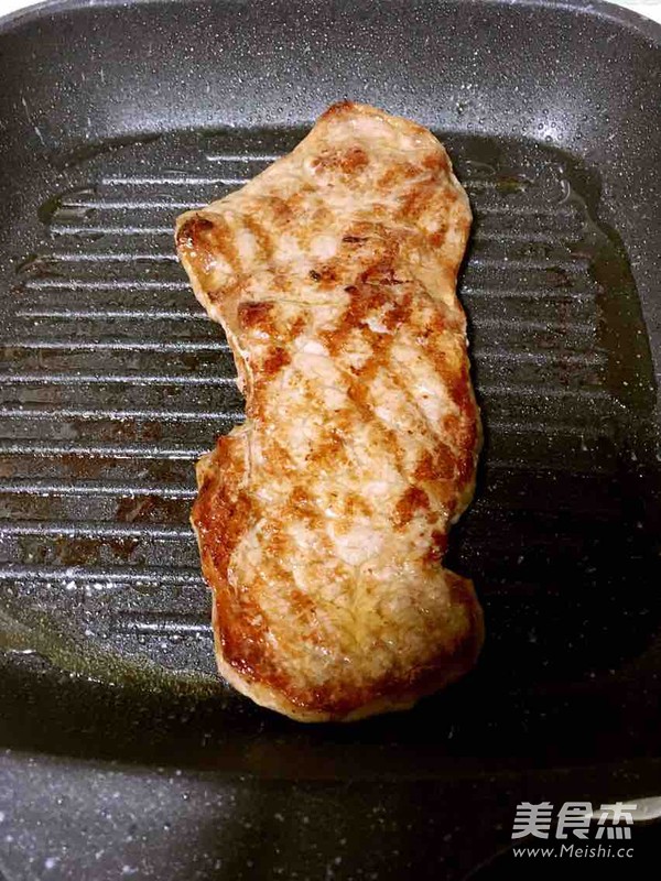 煎锅烧热放入玉米油,放入西冷牛排15秒左右翻一次面,大火煎至两面上色,肉还微微有弹性即可。