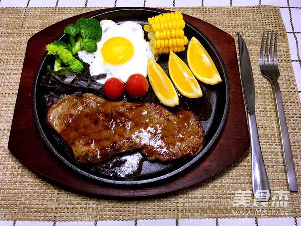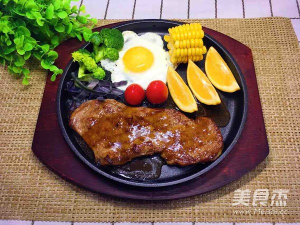 所有食材摆盘,西冷牛排酱和番茄酱加一点水烧开后淋在西冷牛排上就可以了。