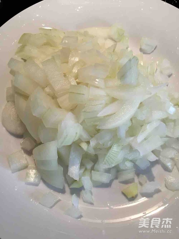 洋葱剥皮洗净,剥去最外一层洋葱肉,切小丁。放置一旁备用。