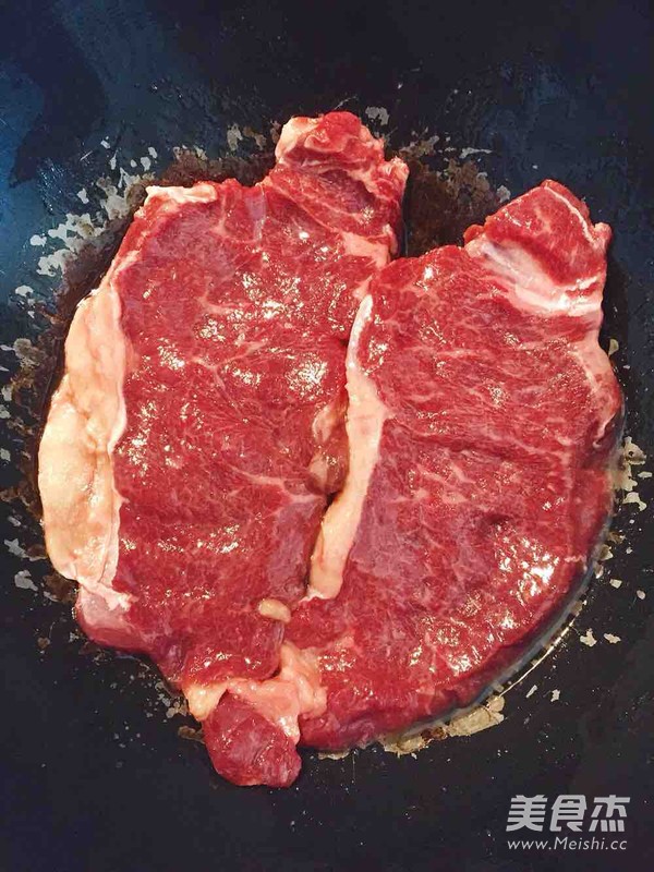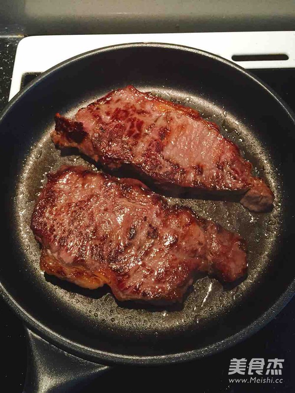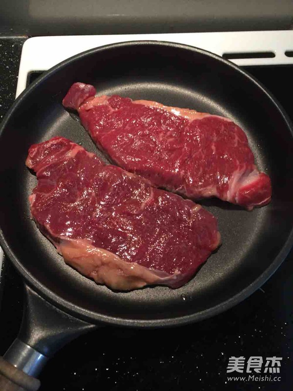煎锅用大火加热半分钟,放入西冷牛排煎制两分钟。不用翻面。