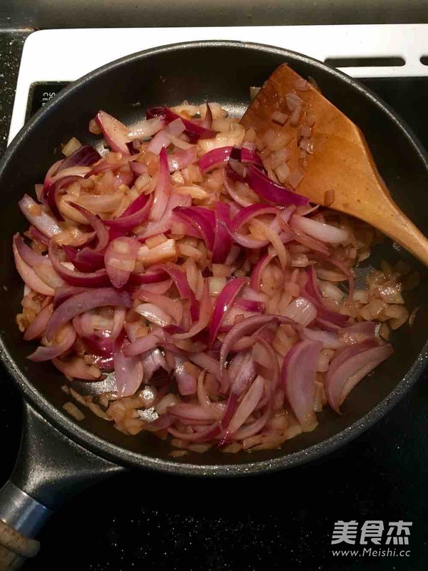 煎西冷牛排剩下的油不必倒掉,直接倒入洋葱,大火翻炒。翻炒大约三分钟后,加入一汤匙水,继续翻炒片刻。然后倒入一汤匙酱油和一汤匙食醋,翻炒拌匀后装盘备用。