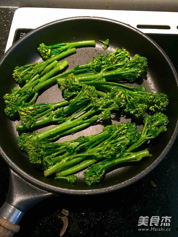 此时煎西冷牛排的油应该已经基本用尽了。煎锅继续加热,加入一汤匙植物油,将西兰花倒入,大火翻炒三分钟。倒入一汤匙水,继续翻炒至水分蒸发完全。均匀撒入些许食盐,拌炒几下盛出备用。