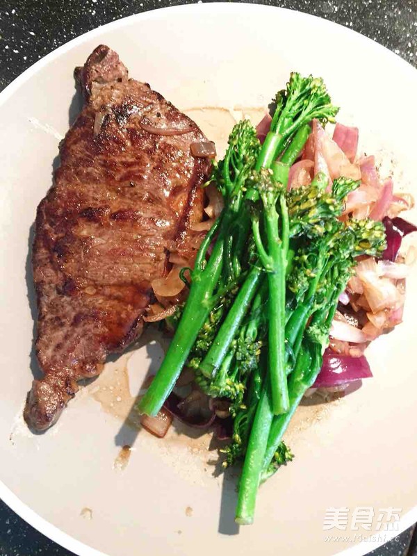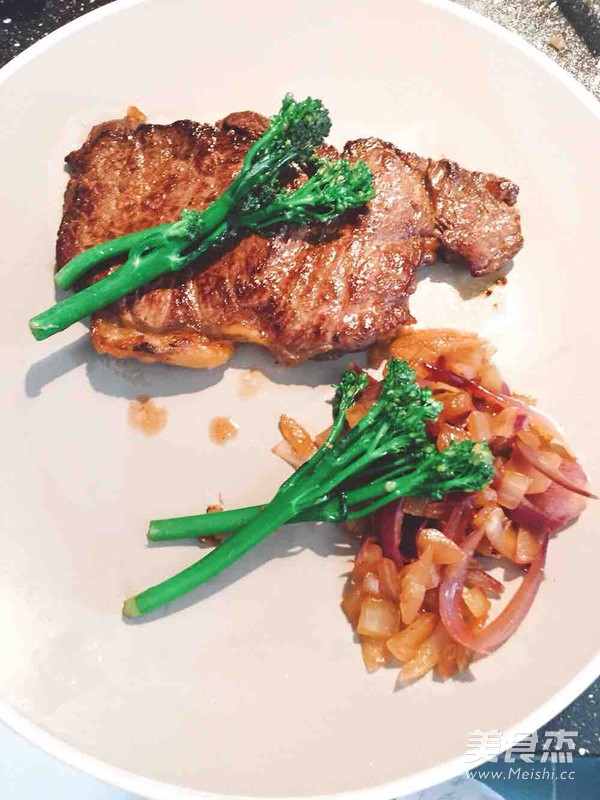 选取大盘,盛入西冷牛排,在西冷牛排旁边摆置洋葱和西兰花,就可以上桌啦!