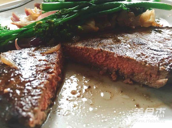 1.牛肉擦净,取两汤匙植物油,抹匀整片牛肉。撒盐少许,均匀涂抹。在室温下放置30分钟。