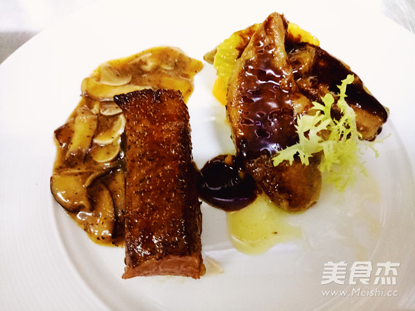 把调好酱汁浇在鹅肝上,蘑菇酱浇在西冷牛排旁边,再撒上芒果肉即可!