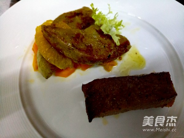 将已煎好的鹅肝摆在果肉上面放上柳橙搭配苦菊装饰,放上已烤好的牛扒。