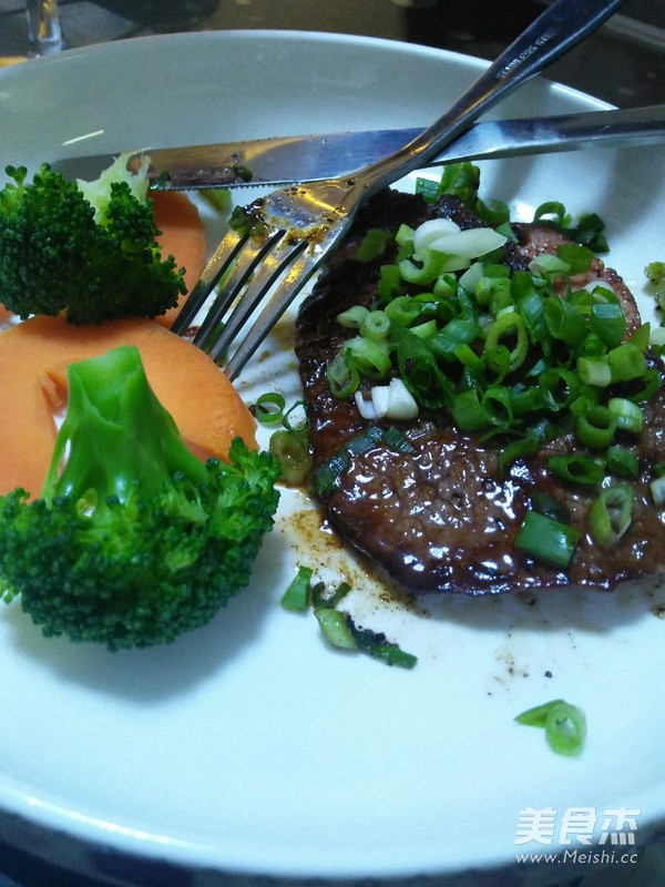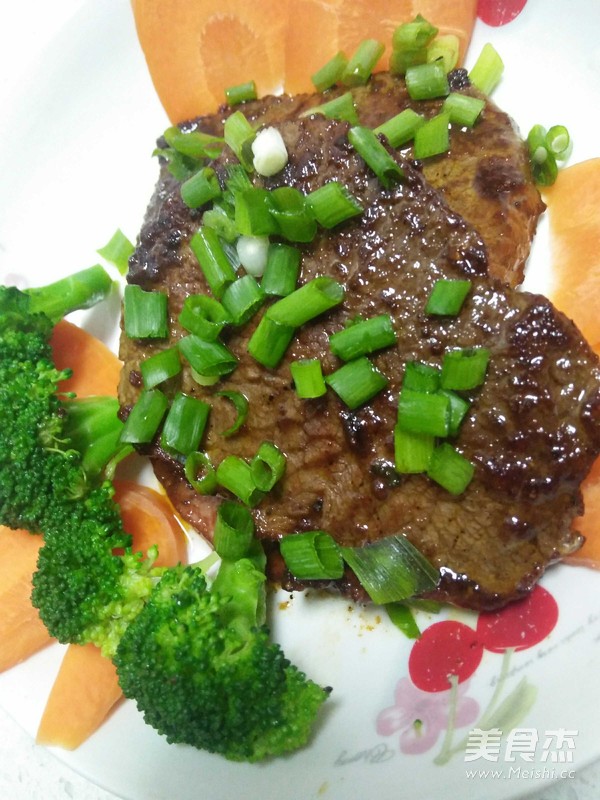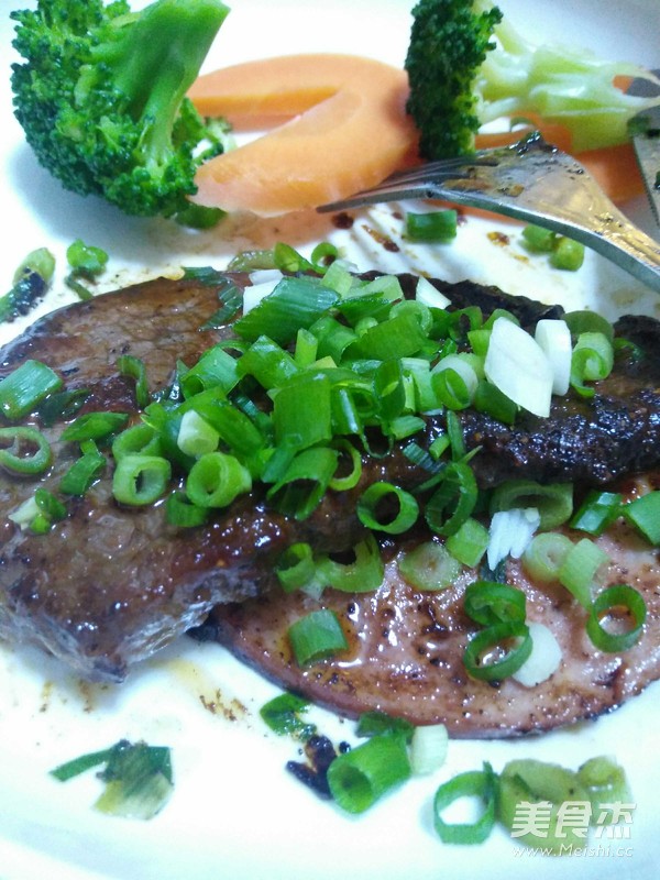 等油冒烟放入切好的牛肉煎5分钟左右,记得要小火喔,在倒入少量红酒等汁水收干放入黑胡椒和少许海盐,把肉翻过来同样的步骤就OK啦